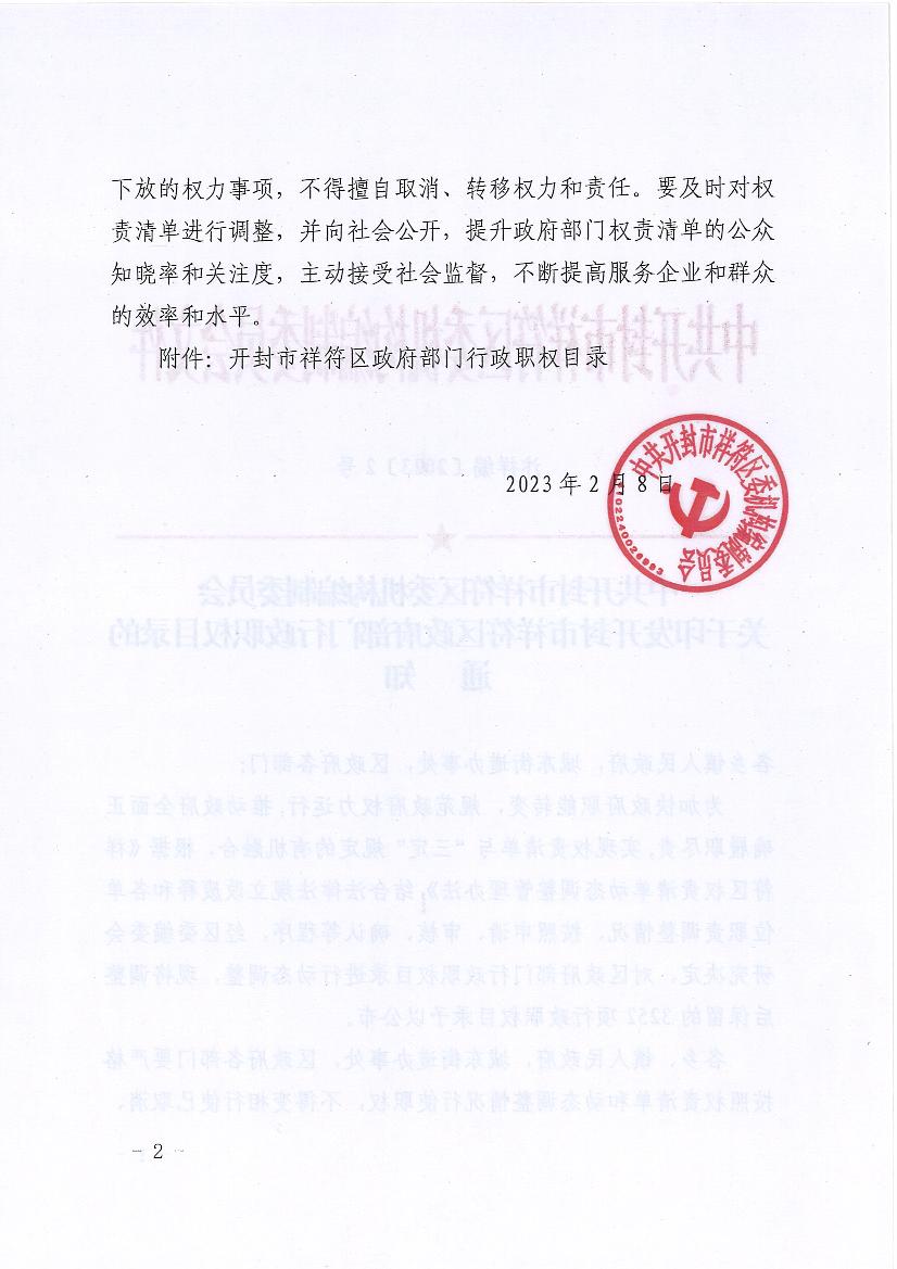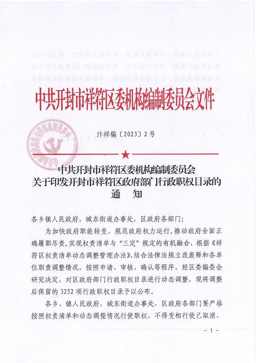 汴祥编〔2023〕2号中共开封市祥符区委机构编制委员会 关于印发开封市祥符区政府部门行政职权目录的通知