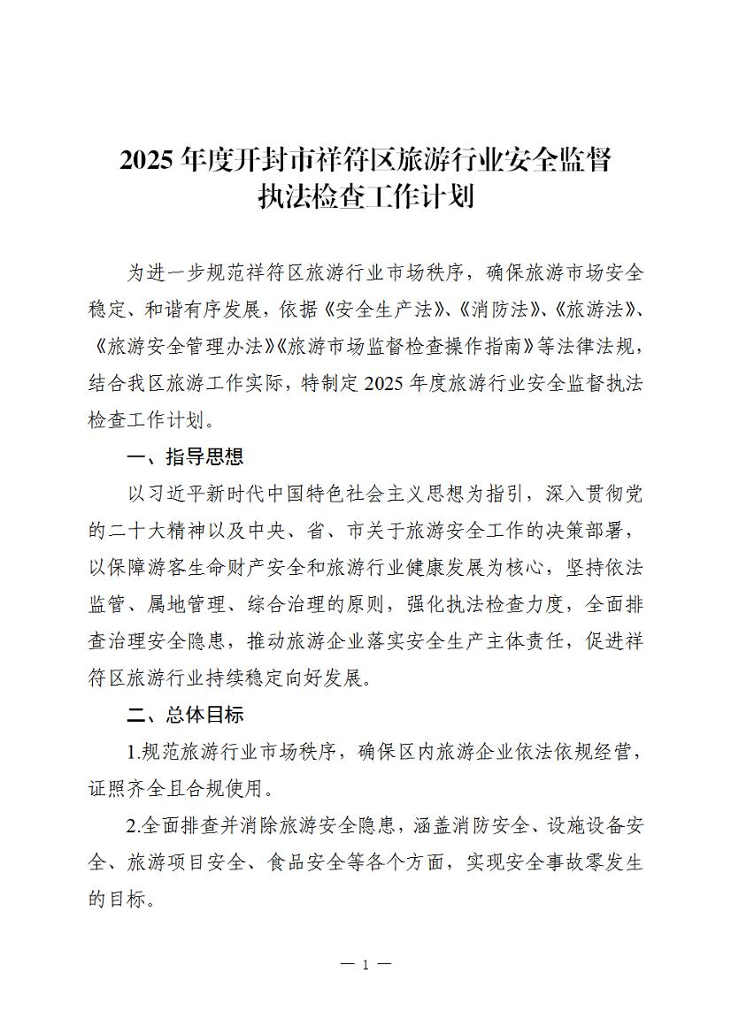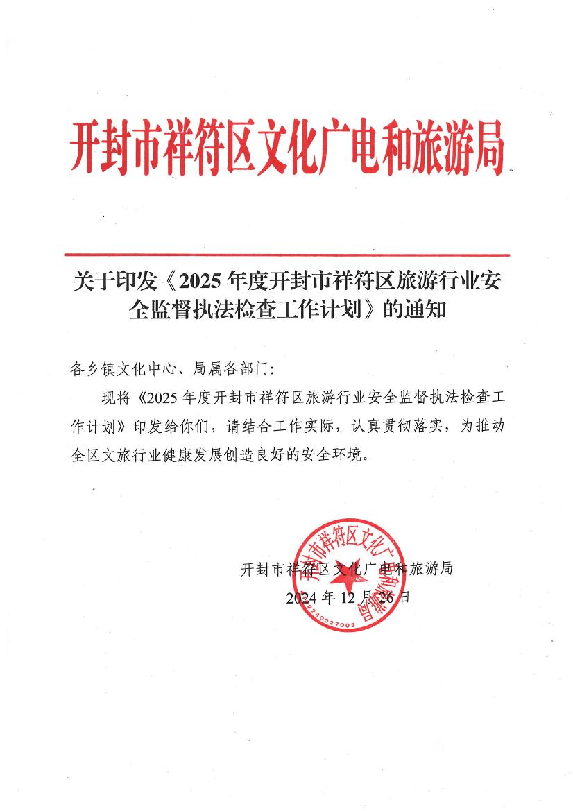 关于印发《2025年度开封市祥符区旅游行业安全监督执法检查工作计划》的通知