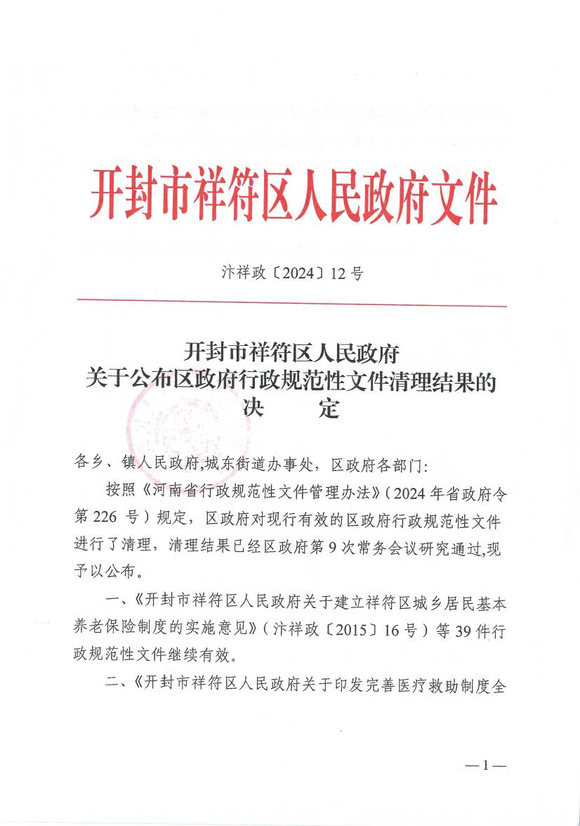 汴祥政〔2024〕12号开封市祥符区人民政府关于公布区政府行政规范性文件清理结果的决定