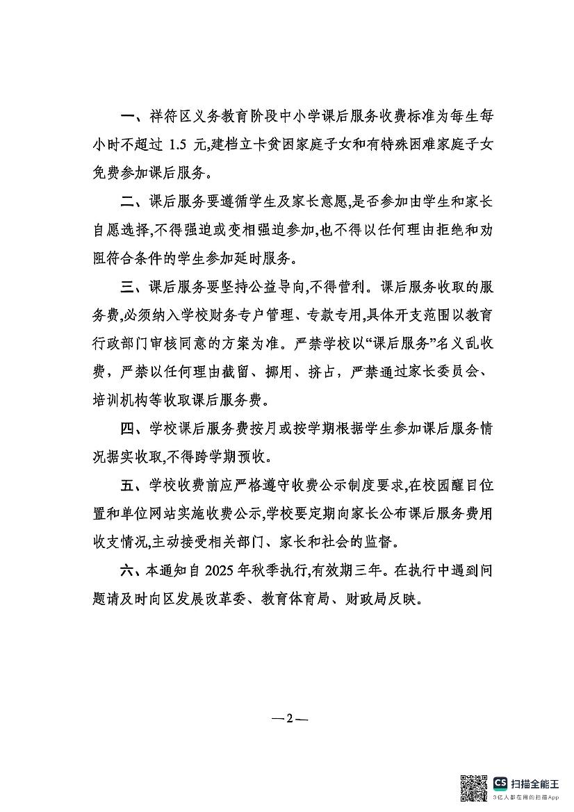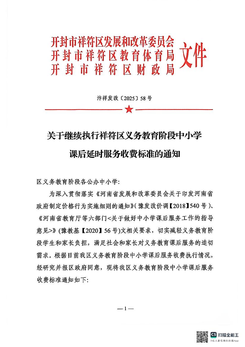 关于继续执行祥符区义务教育阶段中小学课后延时服务收费标准的通知