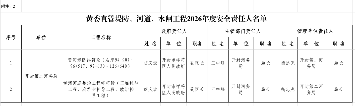黄委直管堤防、河道、水闸工程2026年度安全责任人名单